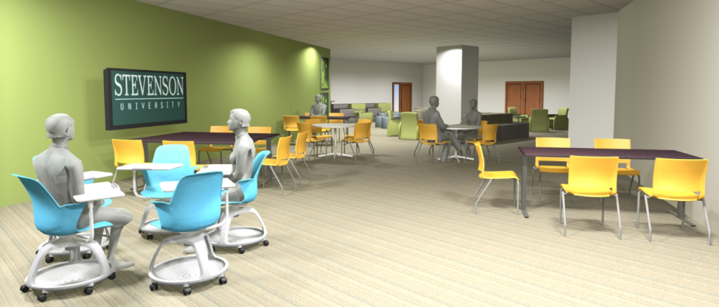 Phase two—planned for Summer 2023—will focus on renovating the Center’s offices for Student Activities staff and for several Stevenson clubs and organizations including the Student Government Association (SGA), Mustang Activities and Programming (MAP), and the Commuter Student Association, among others. Faculty offices currently in the Garrison Hall space will relocate to Owings Mills North with the opening of the new Philip A. Zaffere Library in Fall 2023.