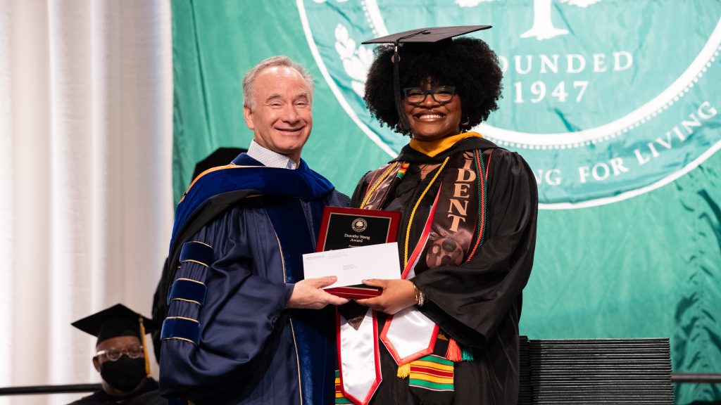 Gabrielle Williams (Business Administration) received the Dorothy Stang Award. This award may be conferred on one graduating senior who best exemplifies devotion to the good of the wider community as reflected in the life of Dorothy Stang, a member of the Sisters of Notre Dame de Namur, the original founders of Stevenson University. Stang’s commitment to bringing social justice to the underprivileged in Brazil led to her murder. The award honors integrity, courage in the face of adversity, and a willingness to act on convictions without regard to consequence. Embodying the most cherished values that an education from Stevenson University instills in its students, the recipient of the Stang Award reaches out to members of the community with financial, spiritual, social, or cultural needs.