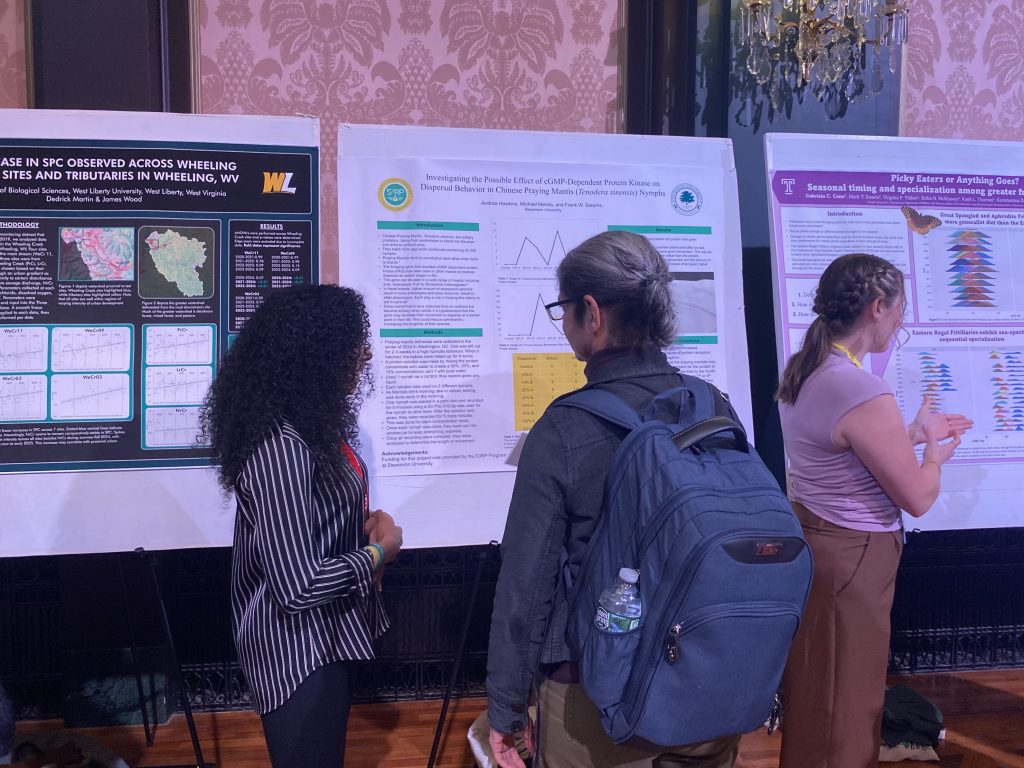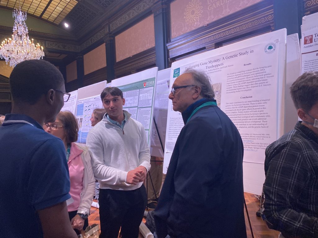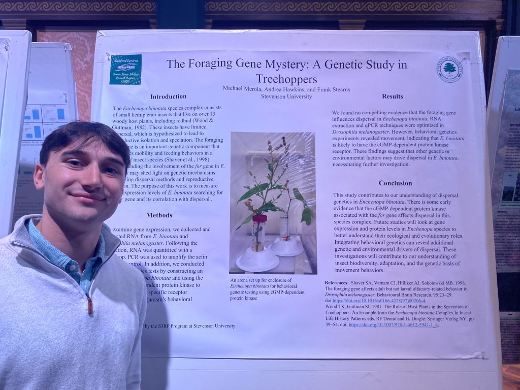 Biology majors Andrea Hawkins (’25) and Mike Merola (’25) presented two posters based on their Summer Science Scholars Research Program (S3RP) work with Dr. Frank Stearns, Assistant Professor of Biological Sciences: “Investigating the Possible Effect of cGMP-Dependent Protein Kinase on Dispersal Behavior in Chinese Praying Mantis (Tenodera sinensis) Nymphs” and “Gene Expression and Dispersal: Investigating for Gene in the Enchenopa binotata Species Complex.”