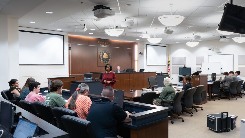 As a great experiential resource for Stevenson undergraduates in our B.S. in Legal Studies program, the university’s Francis X. Pugh Courtroom lets our students practice law hands-on in a real courtroom environment and provides our award-winning Mock Trial Team a practice space for upcoming trials and competitions.