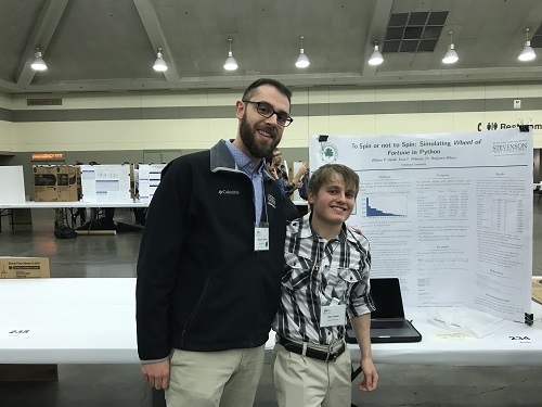 Several Stevenson Applied Mathematics majors also attended the JMM including Billy Heidel (’20), Joshua Lang (’21), and Lindsey Weishaar (’19, second picture above). Billy presented a poster in the Undergraduate poster session based on his research with math faculty member, Dr. Ben Wilson (top picture). His poster was titled To Spin or Not to Spin: Simulating Wheel of Fortune in Python. Another presenter in the poster session was Samantha Bothwell, the daughter of Stevenson adjunct math professor Cynthia Bothwell (3rd picture). A math major at Colorado State University, Samantha’s poster was titled Effects of Maternal Complications on Circulating Protein Profiles in Pre Term Infants.