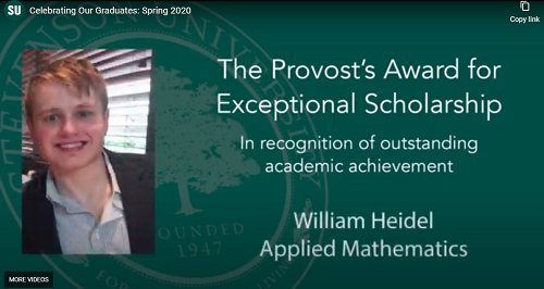 Warmest congratulations to Billy Heidel, Applied Math ’20, on winning the Provost’s Award for Exceptional Scholarship at the Graduation Celebration! This amazing award recognized Billy’s academic successes in his classes and in his research. We’re all so proud of all he’s done and look forward to his future successes!