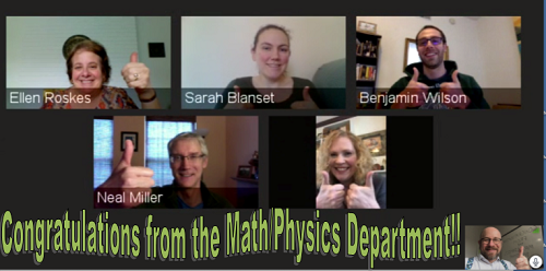 Congratulations to applied math major, Billy Heidel, on receiving the 2020 Academic Excellence Award in the Department of Mathematics and Physics! This award is given each May to the graduating senior in applied math who has earned the highest cumulative grade point average at the University’s highest honors level. Billy has been a stellar student and is very well deserving of this award!
