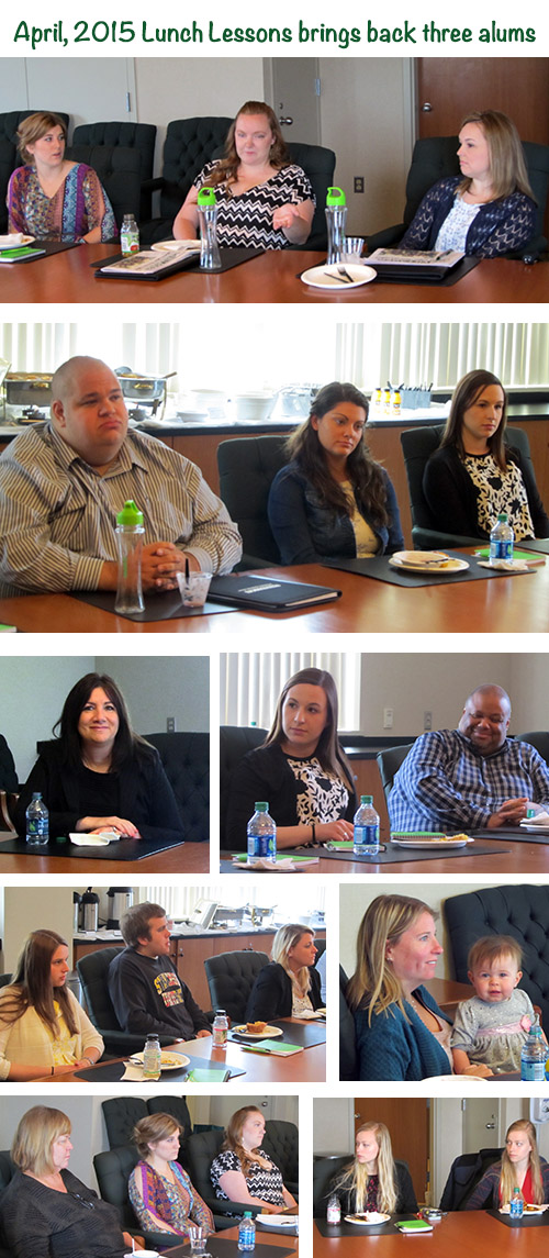 Students and faculty in the Business Communication major welcomed back three alums who joined us for the final "Lunch Lessons" of the semester on Monday, April 27, for a delicious brunch of French toast, yogurt parfaits, and .