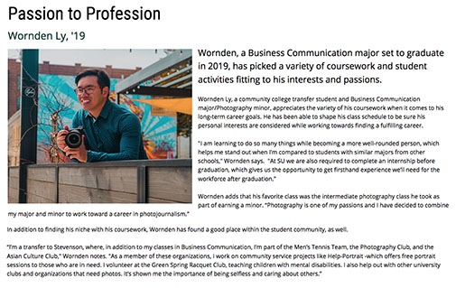 Junior Business Communication major Wornden Ly is the subject of one of Stevenson's "Exceptional Experiences," displayed on the university's home page. He speaks about his passion for writing and photography and hopes to comb.