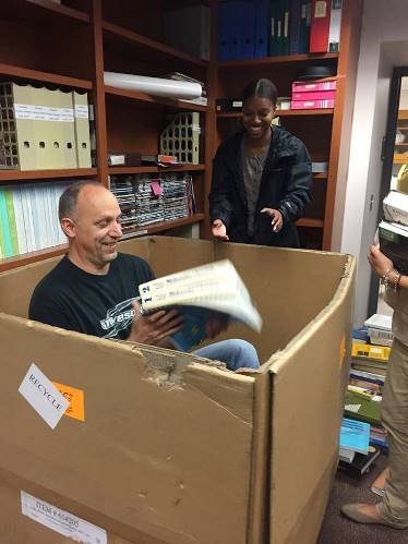 As the semester winds down, faculty are preparing to move their labs and offices to our new building at the Owings Mills North campus. The Center for Environmental Sustainability has organized a book drive to donate unwanted books from faculty offices. Dr. Tim Dwyer is diving right into the offer to help!