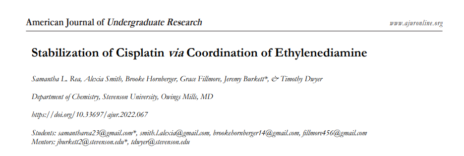 During Biochemistry Integrative lab, students are asked to work in teams to brainstorm and create analogs of Cisplatin, a platinum based chemotherapeutic that is very prevalent in the clinic. Unfortunately, Cisplatin therapy can result in some annoying or even dangerous side effects ranging from tinnitus to nephrotoxicity. The four student authors created and synthesized an ethylenediamine-coordinated Platinum complex, and an ethylenediamine-coordinated Palladium complex, among others, and characterized it. They tested the drugs in live cancer cell line culture and compared the data to the native Cisplatin. They were encouraged by their faculty mentors, Drs Burkett and Dwyer, to collate the data and sumbit it for publication. Their paper finally appears in the December 2022 issue of AJUR Volume 19 Issue 3. Congratulations to these first-time authors!