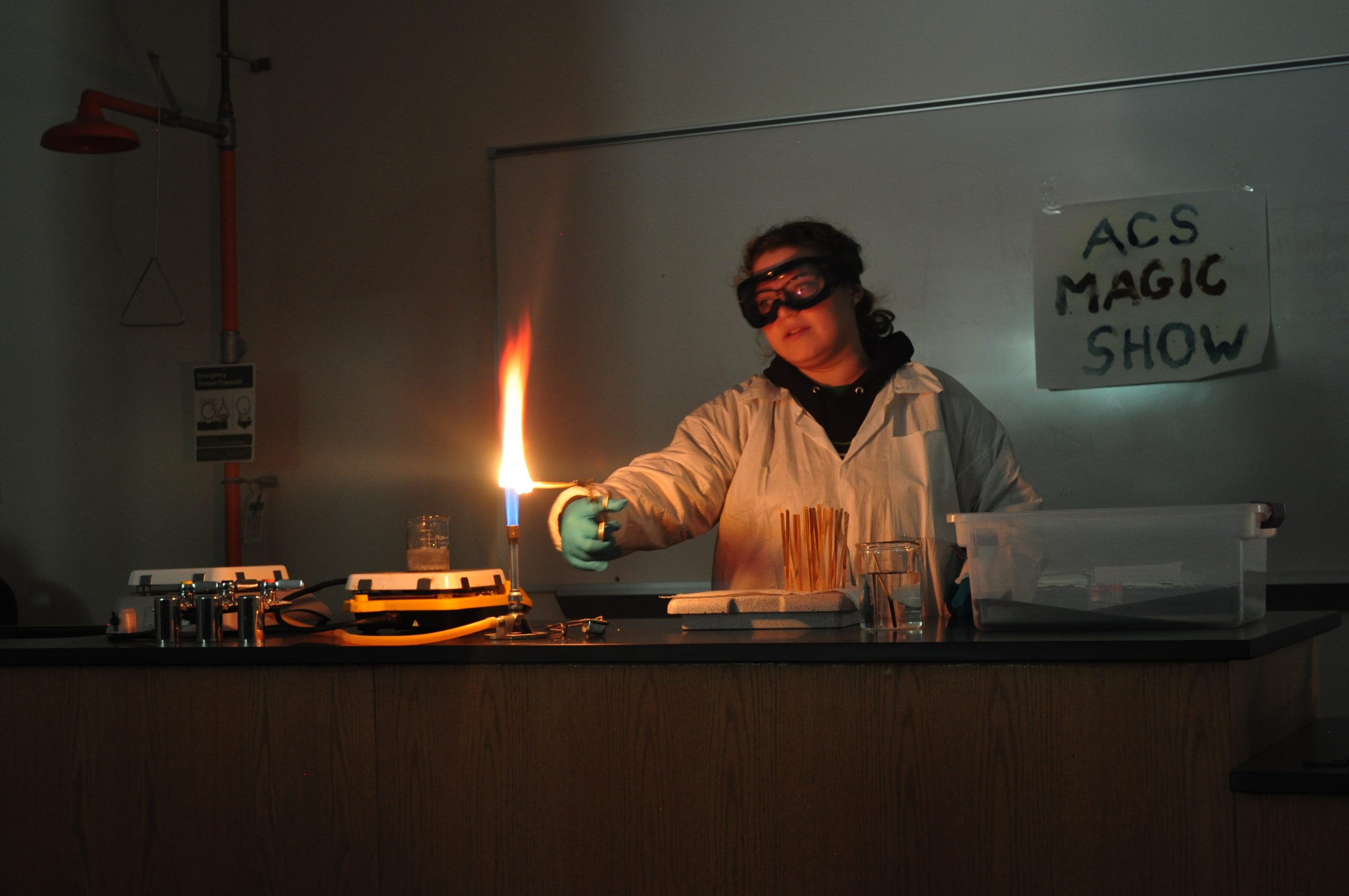 The American Chemical Society club puts on a chemistry magic show every year. Recently their show has become an event in the Maryland Stem Festival. They performed the show to a packed room of county middle school students and to our own underclassmen. New this year was the enhanced flame test, which demonstrates the colors emitted by metals when they are heated in a flame. Senior chemistry major Olivia Apicella is shown conducting the flame experiment. Many other club members also presented experiments.