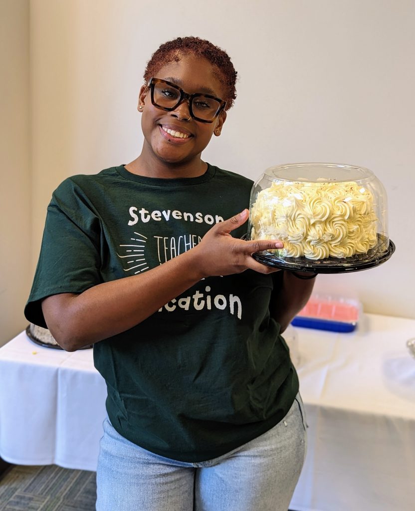 The highlight of the event was the second annual cake walk, instituted by the Dean of Education, Dr. Beth Kobett. Each faculty member provided a home-baked or store-bought gourmet cake (or two!) to win as prizes. Dr. Bob Pelton served as DJ as students walked from one numbered footprint to the next in time to the music. When the music suddenly stopped, a random number was selected and whoever was standing on that number won the cake of their choosing. Some students began to partake of their cakes right away while others left them intact to share with friends and roommates.