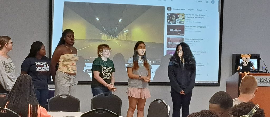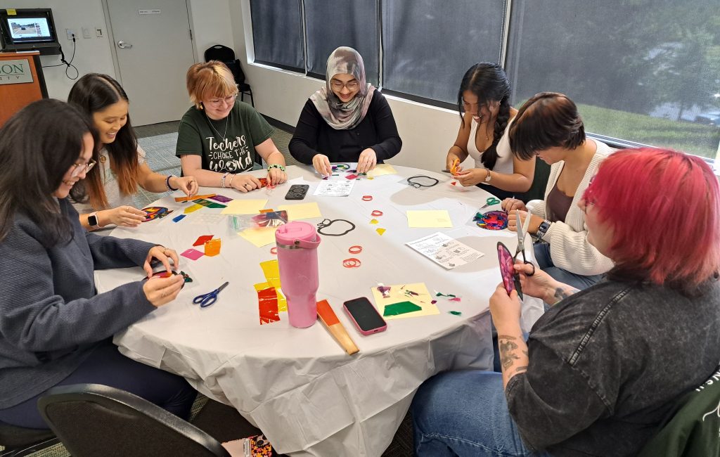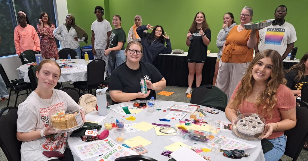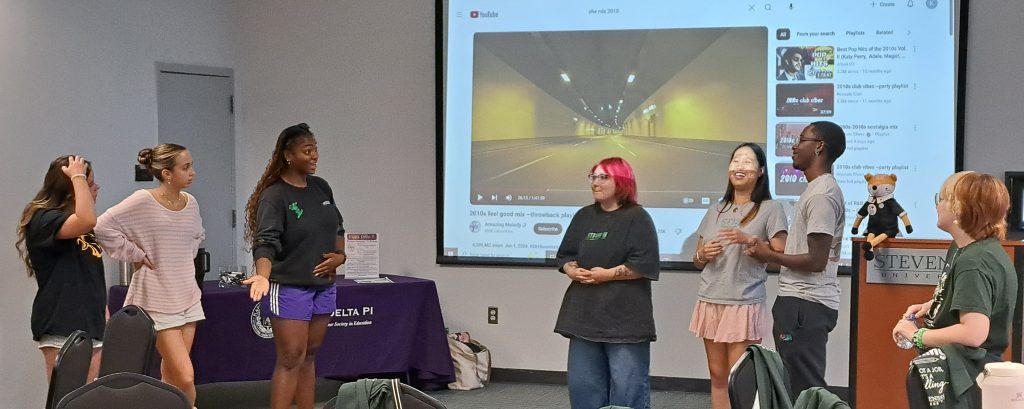 After every student received a complimentary Stevenson green Education t-shirt, the event kicked off with a craft activity. Students created “stained-glass” apples made of different color transparent plastic to hang in their windows. Next three officers of Kappa Delta Pi, an international honor society in education, shared their roles and described the organization. Seniors Kylie Zimmerman, Treasurer, Anna Johnston, Recruitment, and Abby Slovikosky, Secretary, explained the criteria to join KDP and some of the benefits of membership, such as an induction ceremony, Praxis preparation, teacher discounts, and access to scholarships. The officers then had the participants play a BINGO icebreaker activity. Each participant had to fill up their BINGO card by finding someone that could answer a question, a different person for each square. The winner of BINGO was awarded a $15 gift card. The other officers are Erica Goodwin, President, Gabby Green, Vice President, and Emma Breznak, Historian. The faculty sponsors are Dr. Meers-Gimon and Dr. Shafi.