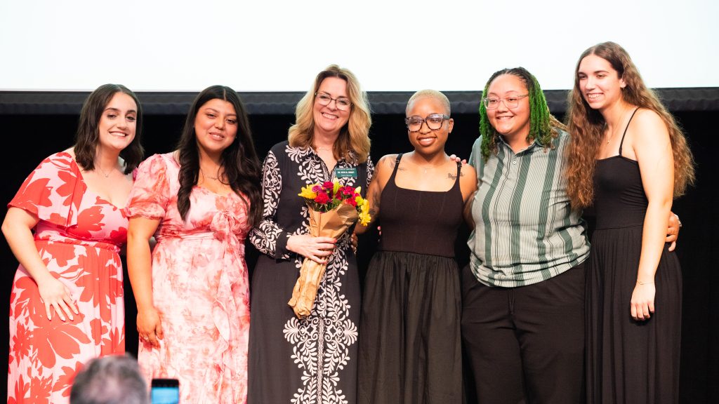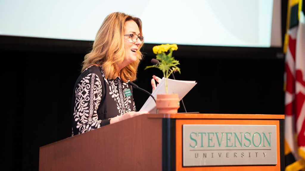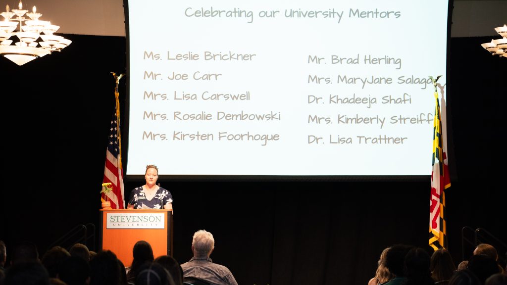 Following the pinning, the students assembled at the front of the stage to recite the Teacher’s Creed, led by Dr. Pelton. They each received a gift bag and a potted marigold. Dr. Kobett delivered the closing remarks and invited the students and guests to take photos in front of the photo wall, decorated with festive balloons in the Stevenson colors. As everyone enjoyed refreshments, students and their families received congratulations and thanked faculty and mentors for their encouragement and support. It was a touching and memorable event that celebrated all in attendance and welcomed the graduates into the teaching profession.