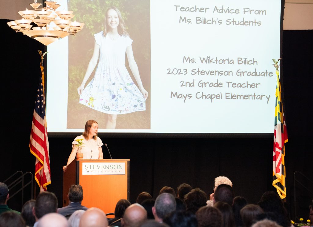 The next video was introduced by Wiktoria Bilich ’23, second grade teacher a Mays Chapel Elementary School. She began, “I’m reminded every day that children are far more perceptive than we often realize. They notice how you speak to them. They remember how you make them feel. They listen, even when it seems like they’re not. And they teach us just as much as we teach them.” She continued, “who better to give you advice as new teachers than the kids themselves?” She asked her second graders what they think makes a great teacher. Their answers were sweet, and silly, and incredibly “spot-on.”