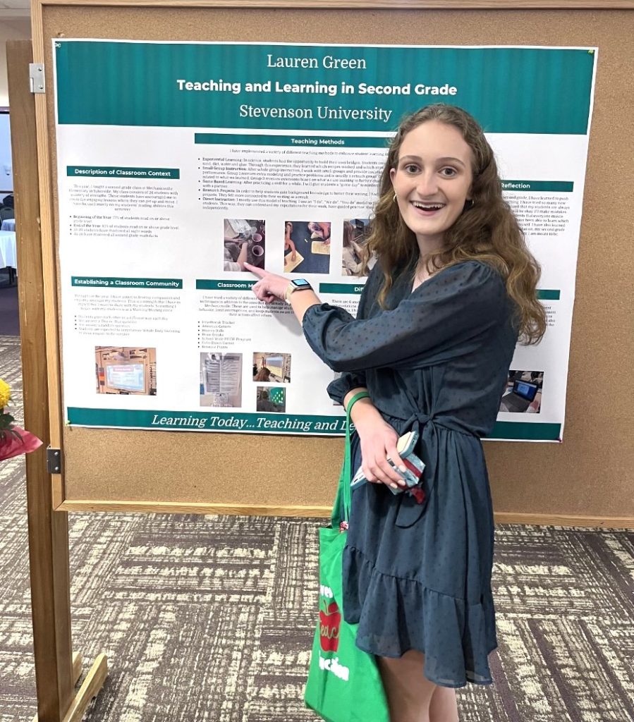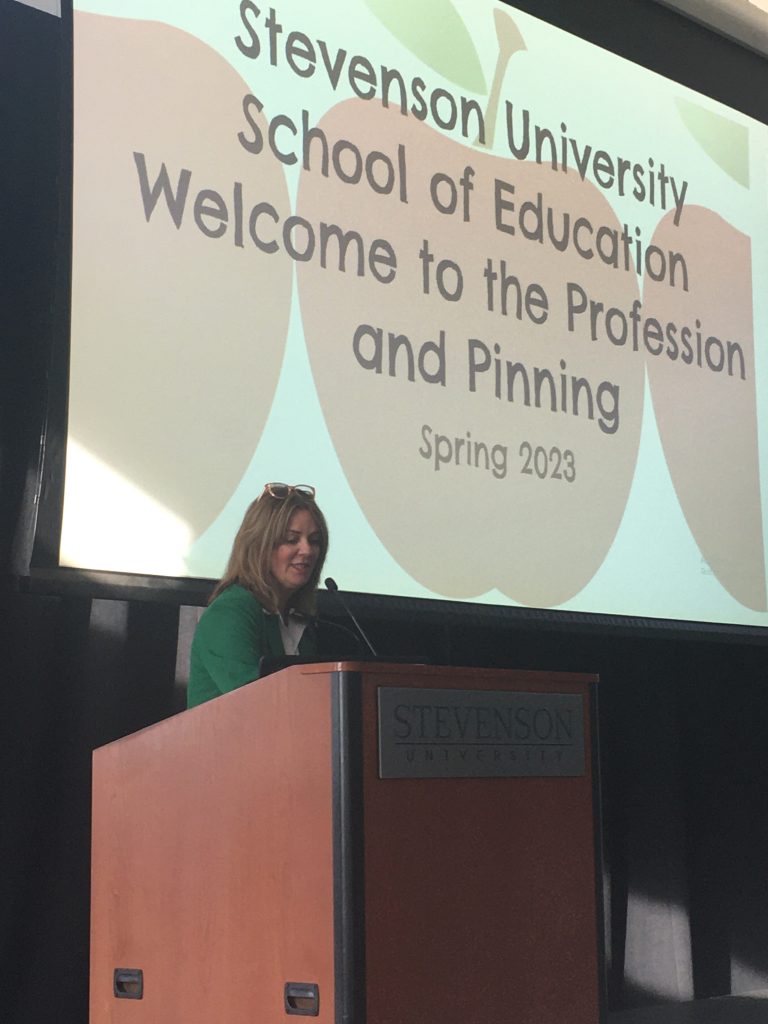 Next, Dr. Kobett introduced featured speaker, Jorden Lim ‘12. Jorden was a member of the first graduating class in Middle School Education at Stevenson, which was also the first graduating class in Middle School Education in the state of Maryland. Ms. Lim began her teaching career at Lake Elkhorn Middle School, where she was a math teacher and team leader. She taught sixth grade math at Thomas Viaduct Middle School for three years before becoming an Algebra I and Gifted and Talented geometry teacher at Long Reach High School in 2017. In addition to her teaching roles at Long Reach, Jorden is the co-leader of the Reach Academy and the Algebra I team leader. Jorden is the 2022 Howard County Teacher of the Year and was honored in Howard County and by the Maryland State Department of Education. In her remarks, Jorden told the graduating seniors, “After 11 years of teaching I have come to recognize that connection is the single most important aspect of being an educator.” She passed along a reminder to help new teachers prioritize connection, “All people are worthy and relational.” This phrase matters in building school and communities, Jorden stressed, to reimagine an education that focuses on connection.