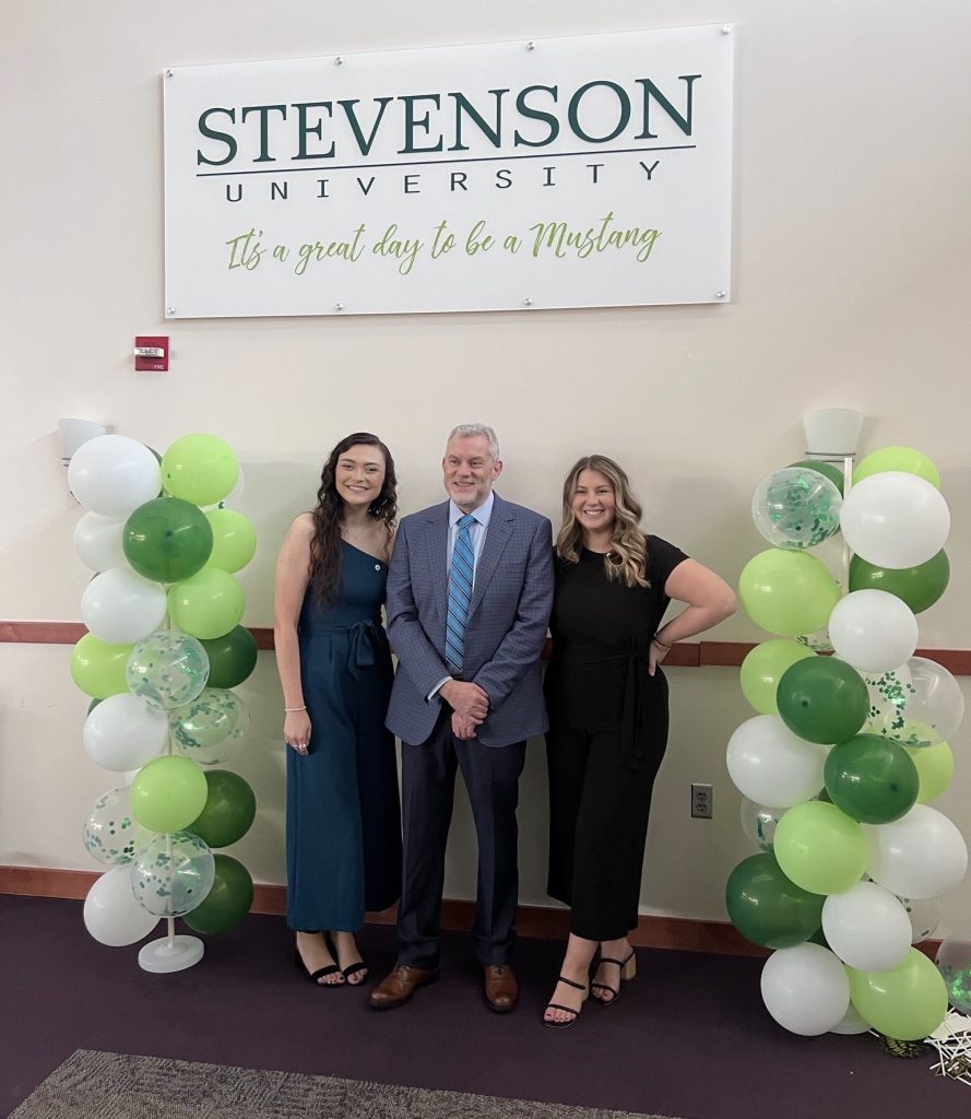 The seniors ended the evening taking photos with invited guests, faculty, mentors, and peers at a special photo backdrop featuring the Stevenson sign and two trees of Stevenson green balloons.