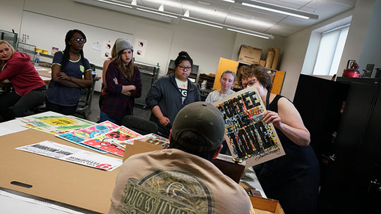 On November 8th and 9th, Mary Mashburn taught two Communication Design III classes how to use the old letterpress in her workshop. She showed the students posters that had been made using a letterpress and taught them how to .