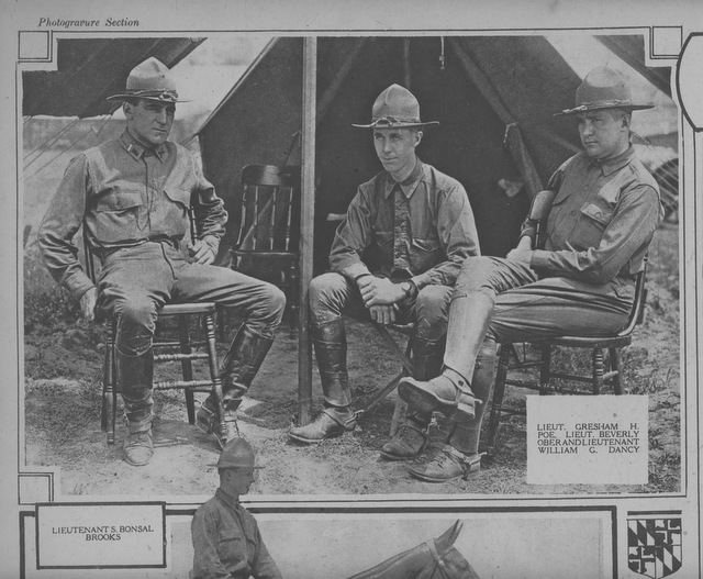 Three officers sitting in front of a tent on the Mexican border in 1916. On left is Lt Gresham H.