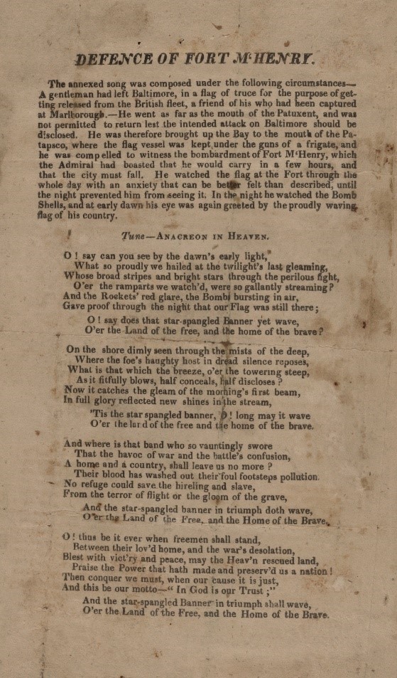 Benjamin Edes was still on the battlefield commanding his infantry company when Francis Scott Key’s father-in-law brought the lyrics to a song to be printed. Titled “Defence of Fort McHenry,” the lyrics were to be sung to the tune of Anacreon in Heaven. Edes’ apprentice, Samuel Sands, printed it as a handbill in Edes absence. The lyrics and that tune became our National Anthem. (Courtesy of the Library of Congress)