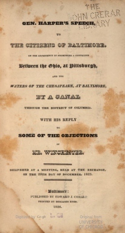 General Harpers’ Speech to the Citizens of Baltimore is an example of how the press served as the social media of its day. Printed by Edes in 1824, this document carried forth the discussion of a canal from Baltimore to Pittsburgh but, in a much larger sense, the discussion of the central government’s role in internal improvements. (Courtesy of the Internet Archive)
