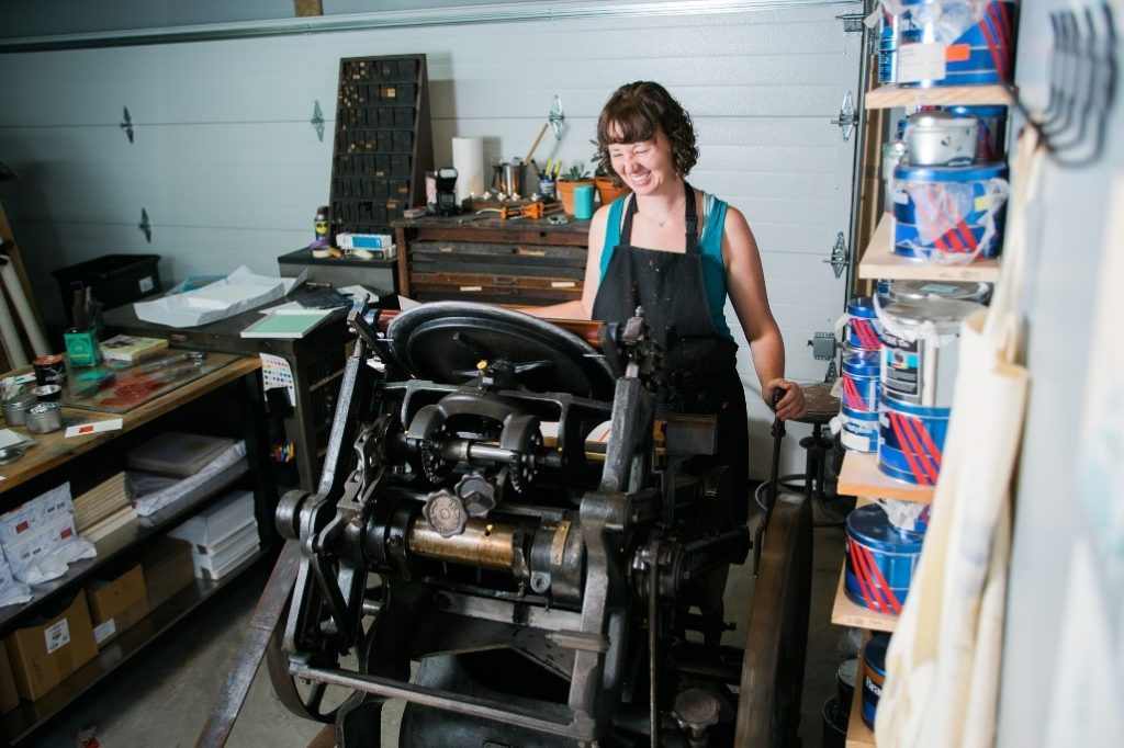 The Tiny Dog Press is proud of the Chandler & Price platen press that does much of their work. It was this form of press that ushered manual printing into the 20th century and was the mainstay of many a printshop from the 1880s through the 1930s. (Photo by Ana – Side A Photography. Courtesy Tiny Dog Press of Baltimore)