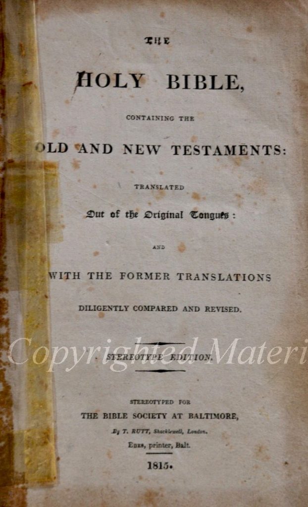 The first recorded evidence of Benjamin’s arrival in Baltimore is a document printed by the partnership Leakin & Edes. Shepard C. Leakin was a longtime resident of Baltimore who would go on to become its mayor. Edes, an experienced printer in New England, began his career in Baltimore through this partnership. Although the partnership would last only about a year, Edes remained a prominent printer in Baltimore from 1809 through his death due to cholera in 1832. In his time as a printer in Baltimore he was associated with the printing of Francis Scott Key’s Defence of Fort McHenry that later became known as the Star-Spangled Banner. He printed Baltimore’s first King James Bible using stereotype printing plate technology that was new in the U.S. at the time.