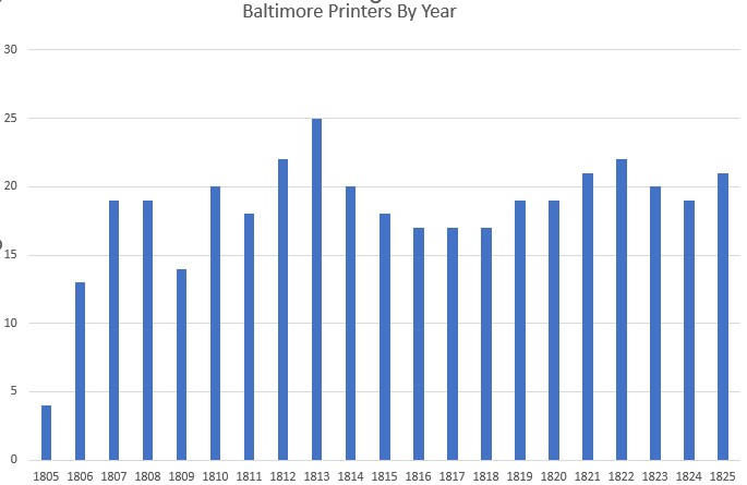 This spreadsheet captures the productivity of Baltimore’s printing community by year between 1805-1825. IStevenson University and Maryland Humanities: Printing in Baltimore Then and Now Project. Funded by the Council for Independent Colleges.)