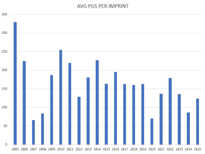 This spreadsheet provides information about the size or length of the average imprint in Baltimore per year. The lower the number, the shorter each imprint was, on average. With printers only being able to set one or two pages of type per day, multi-volume sets were generally beyond a single printer’s ability. Consequently, it was commonplace for several printers to join together and pool resources in order to produce imprints containing a large number of pages across multiple volumes. IStevenson University and Maryland Humanities: Printing in Baltimore Then and Now Project. Funded by the Council for Independent Colleges.)