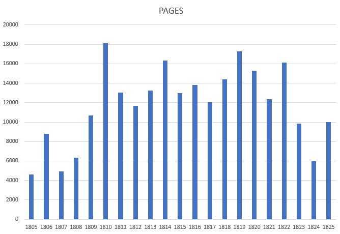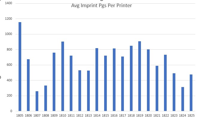 The average annual workload per printer is captured in this chart as measured by average pages printed per year. As can be seen, there were some very lean years for Baltimore’s printers. An interesting phenomenon is that while lean times are seen in 1812-1813, as one would expect as a result of America’s war with England (War of 1812), printing increased dramatically in 1814-1815 when Baltimore was directly attacked by the British or was recovering from that attack. The increase in printing is a result of the paperwork associated with coordinating Baltimore’s defense and recovery. IStevenson University and Maryland Humanities: Printing in Baltimore Then and Now Project. Funded by the Council for Independent Colleges.)