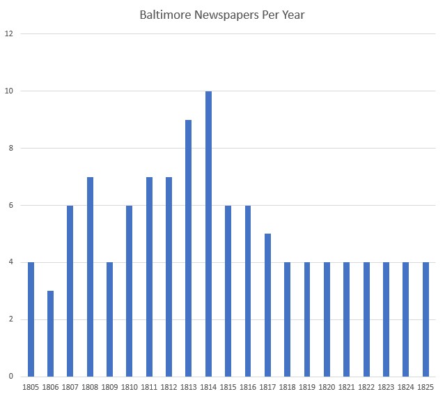 While the number of newspapers printed in Baltimore between 1805-1825 varied between three to ten, by 1818 that number of Baltimore newspapers had stabilized at four. IStevenson University and Maryland Humanities: Printing in Baltimore Then and Now Project. Funded by the Council for Independent Colleges.)