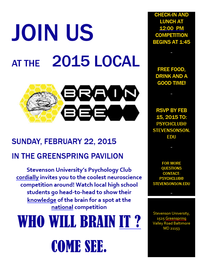 Please join us for the local Brain Bee competition to be held on February 22, 2015!Stevenson University’s Psychology Club cordially invites you to the coolest neuroscience competition around.