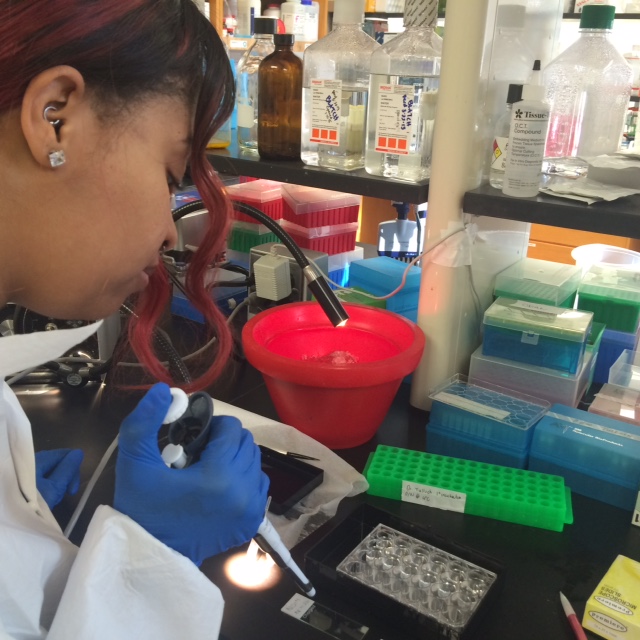 Student Lisa Taffe, an upcoming May 2015 graduate of Stevenson University's Psychology Program, in the lab working on her research project.Her reseach involved monitoring the hunger hormone in the brain of animals that were g.