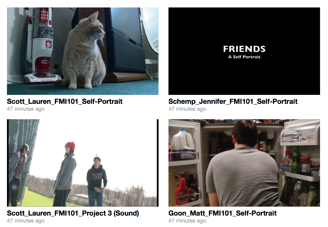 Check out some of the beginning work from Rick Boardman's FMI101 ("Cinema I: Storytelling") class this semester. Click on the photo, above, to be taken to our Vimeo site.