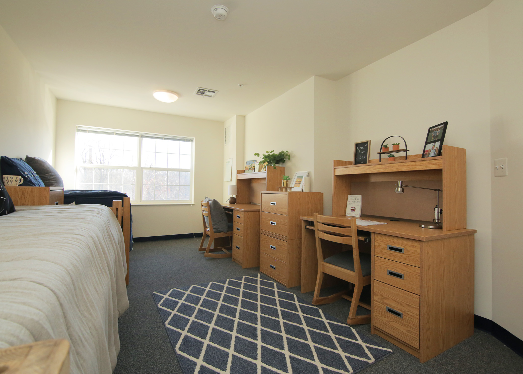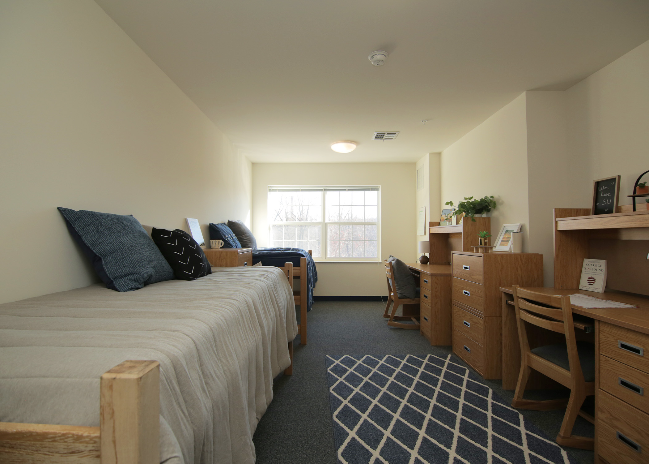 Upperclass students have several options for housing on campus. Starting your second year, choose from our multiple upperclassmen suite floorplans. Starting your third year, you can also choose apartment-style residences with private bedrooms, two bathrooms, and a full kitchen. Your spacious, fully furnished living room will give you space to stretch out and spend time with friends.